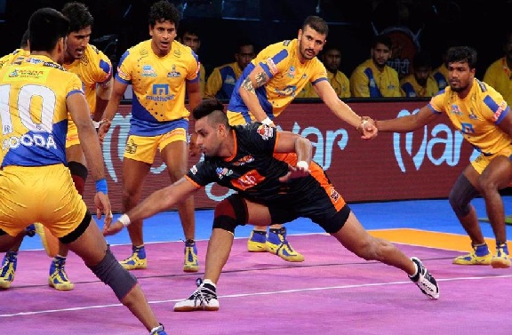 पुणे, 14 अक्टूबर (धर्म क्रान्ति)। प्रो कबड्डी लीग (पीकेएल) के सीजन-5 में शुक्रवार को बंगाल वॉरियर्स ने तमिल थलाइवाज को शिव छत्रपति शिवाजी कॉम्पलेक्स में 34-30 से मात दी। थलाइवाज के कप्तान अजय ठाकुर का बेहतरीन खेल एक बार फिर जाया गया। उन्होंने 14 रेड अंक बटोरे। बंगाल के लिए मनिंदर सिंह ने 12 रेड अंक लिए। दोनों टीमों ने मैच में लगातार अंक लिए, लेकिन बंगाल इस मैच में हर मामले में थलाइवाज से थोड़ी बेहतर साबित हुई और इसी कारण उसे जीत मिली। 10वें मिनट तक स्कोर 6-6 से बराबर था। यहां से मनिंदर ने रेड से दो अंक लेकर बंगाल को 8-6 से आगे कर दिया। बंगाल ने फिर अपनी बढ़त को नहीं खोया और पहले हाफ का अंत 18-14 के स्कोर के साथ किया। दूसरे हाफ में शुरुआती मिनटों में थलाइवाज ने अंकों के अतंर को कुछ कम किया और 27वें मिनट में स्कोर 19-22 कर लिया, लेकिन यहां से वो बेहद कोशिशों के बाद भी अंकों के अंतर को कम नहीं कर पाई। थलाइवाज के रेडर उसे अंक दिला तो रहे थे, लेकिन उसका डिफेंस अंक गंवाया जा रहा था। अंतत थलाइवाज अंकों का अंतर कम नहीं कर पाई और हार गई।